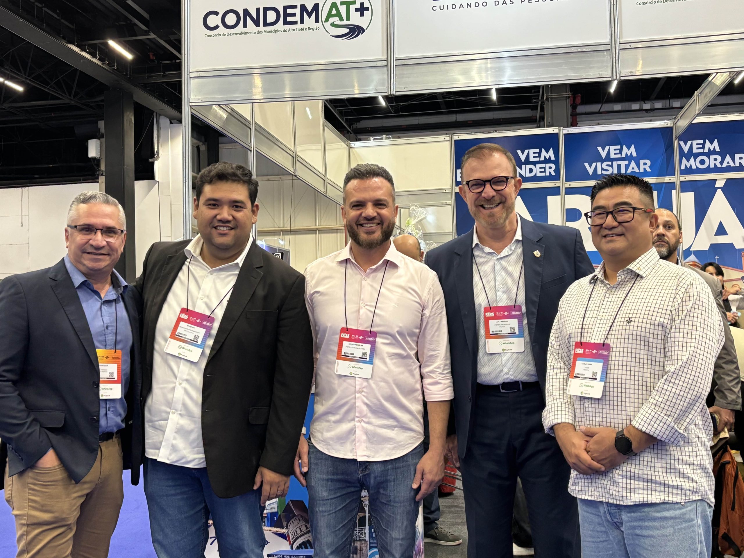 A abertura oficial da Feira do Empreendedor 2025, nesta quarta-feira (15/10), marcou a participação inédita do Consórcio de Desenvolvimento dos Municípios do Alto Tietê e Região (CONDEMAT+) no maior evento de empreendedorismo da América Latina, que segue até sábado (18/10), no São Paulo Expo. A cerimônia contou com a presença do presidente do consórcio e prefeito de Itaquaquecetuba, Eduardo Boigues; do prefeito de Suzano, Pedro Ishi; do prefeito e da primeira-dama de Arujá, Luiz Camargo e Clau Camargo; e do vice-prefeito de Guararema, Odvane Rodrigues, além do secretário executivo do CONDEMAT+, Adriano Leite.