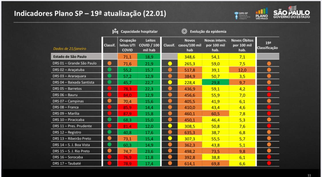 O retrocesso é reflexo do aumento do número de casos, internações e óbitos. Em todo o Estado, sete regiões ficaram na fase vermelha e 10 entraram na laranja. A mudança implica na redução do horário de funcionamento de comércios e serviços para oito horas/dia durante a semana, com limitação de atendimento até 20 horas e 40% da capacidade. No período das 20 às 6 horas só podem funcionar os estabelecimentos essenciais. O mesmo vale para os finais de semana (30 e 31 de janeiro e 6 e 7 de fevereiro).