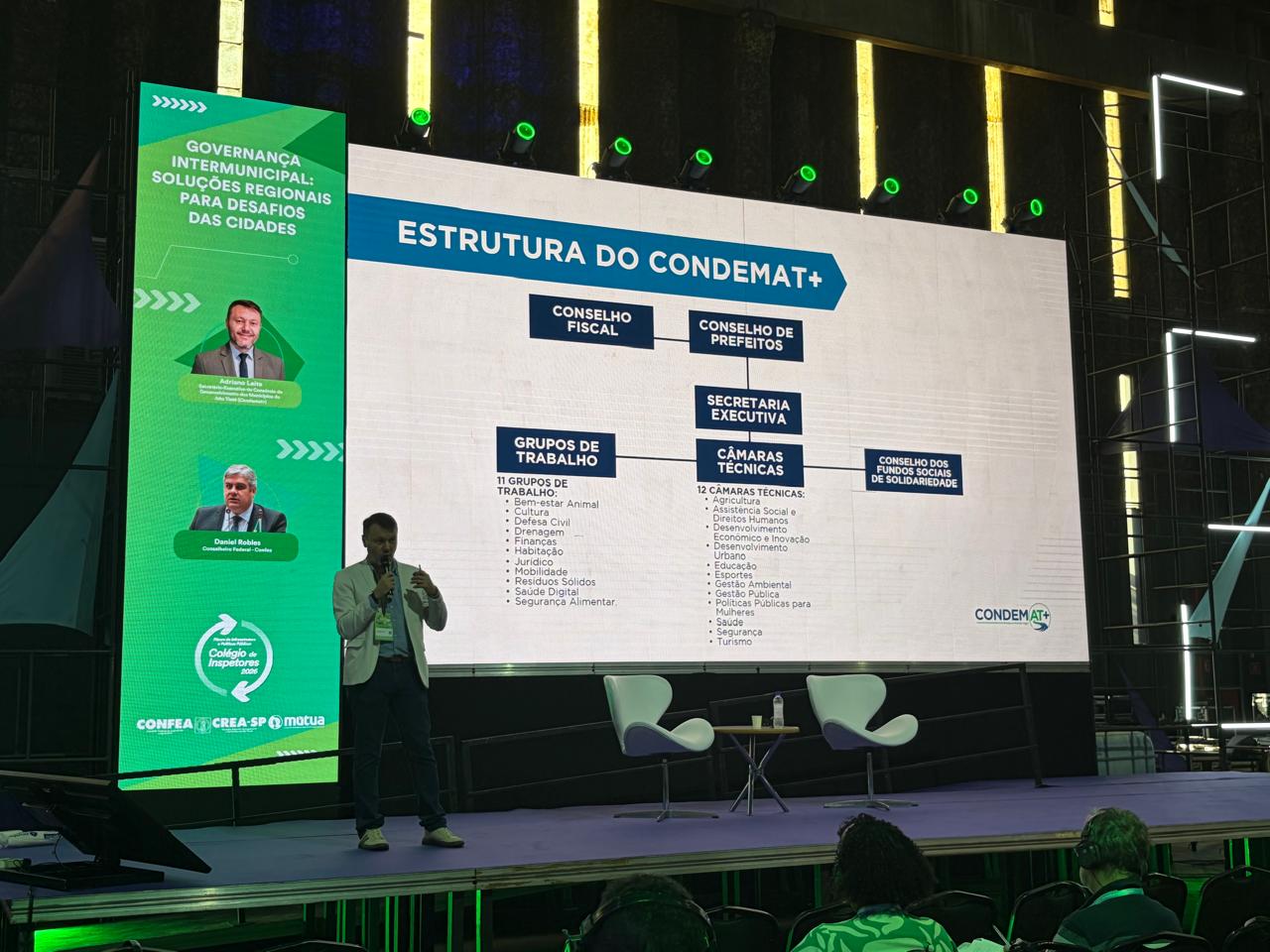Representando o consórcio, o secretário executivo Adriano Leite participou da programação do Palco 2 (Infra.BR: Governança, Saneamento e Meio Ambiente), onde abordou o tema “Governança Intermunicipal: Soluções Regionais para Desafios das Cidades”, ao lado do conselheiro Daniel Robles, do Conselho Federal de Engenharia e Agronomia (Confea). Na ocasião, Adriano apresentou o trabalho desenvolvido pelo CONDEMAT+, destacando a importância da atuação regional integrada. Após as exposições, o debate foi ampliado com perguntas do mediador e participação do público presente.